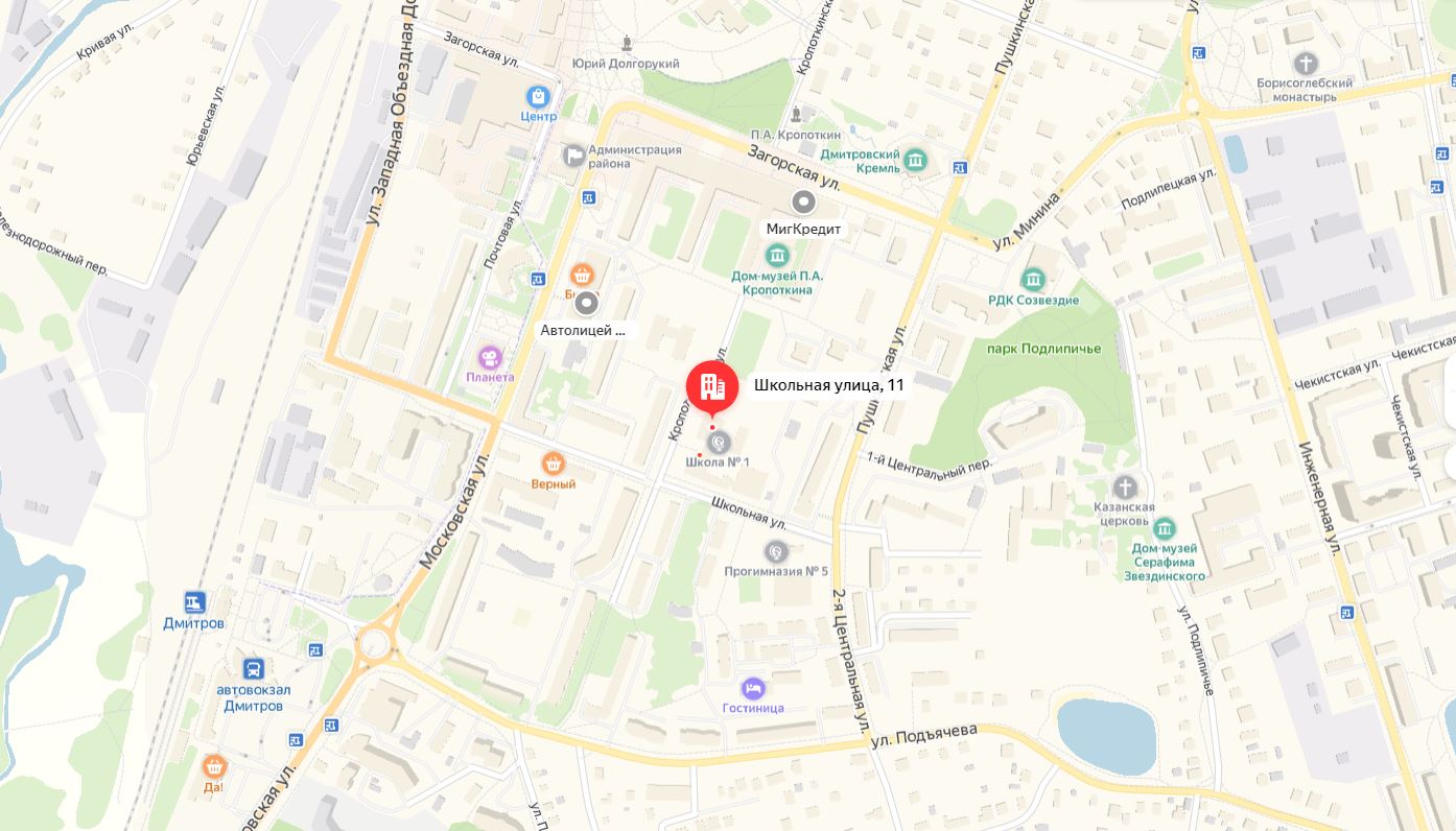 ППЭ 601 – МОУ Дмитровская средняя общеобразовательная школа №1 им. В.И. Кузнецова (г.Дмитров, ул.Школьная, 11);
