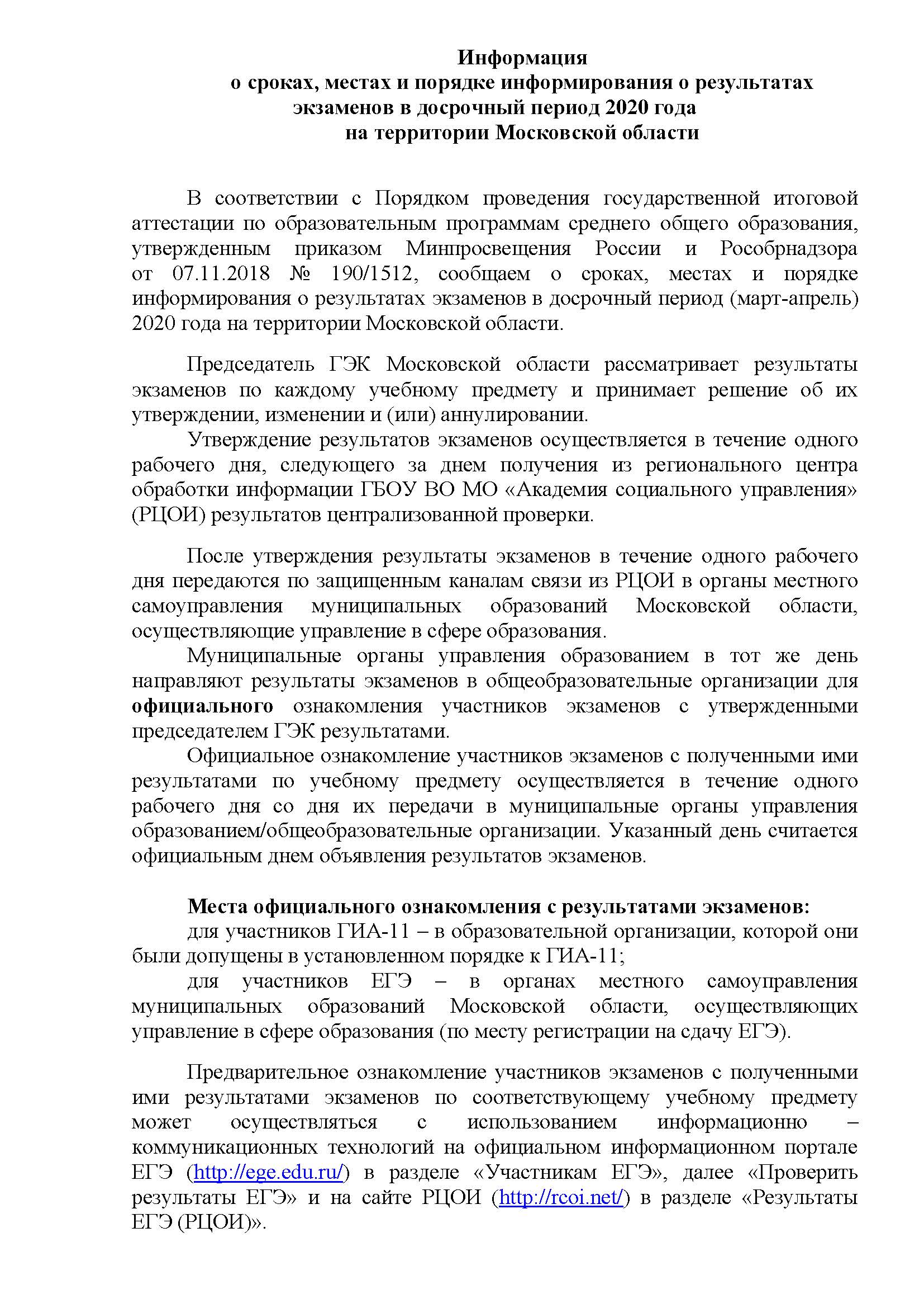 Информация о сроках, местах и порядке информирования о результатах экзаменов в досрочный период 2020 годана территории Московской области